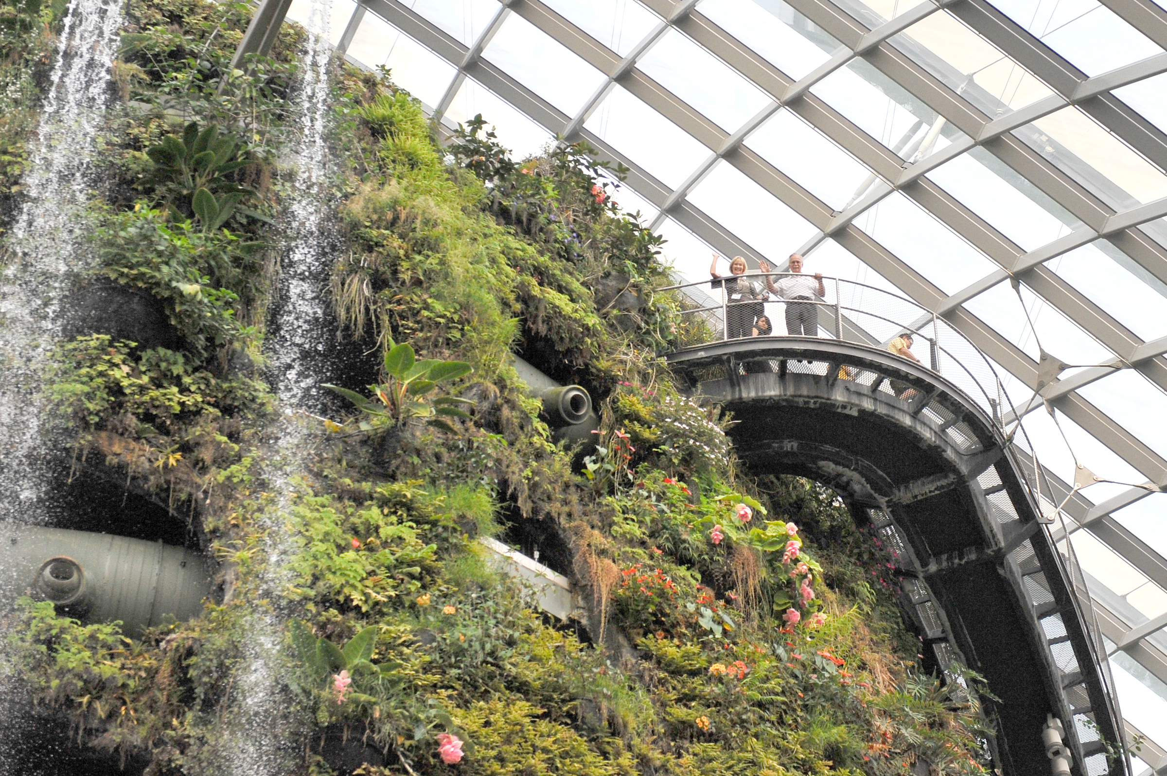 Singapore is quite prosperous and each time we visit we find a new attraction has opened. This time we visited the newly completed Gardens by the Bay, which includes several Conservatories, each highlighting a different climatic zone. Here we are above the world’s tallest indoor waterfall in the Cloud Forest Conservatory.