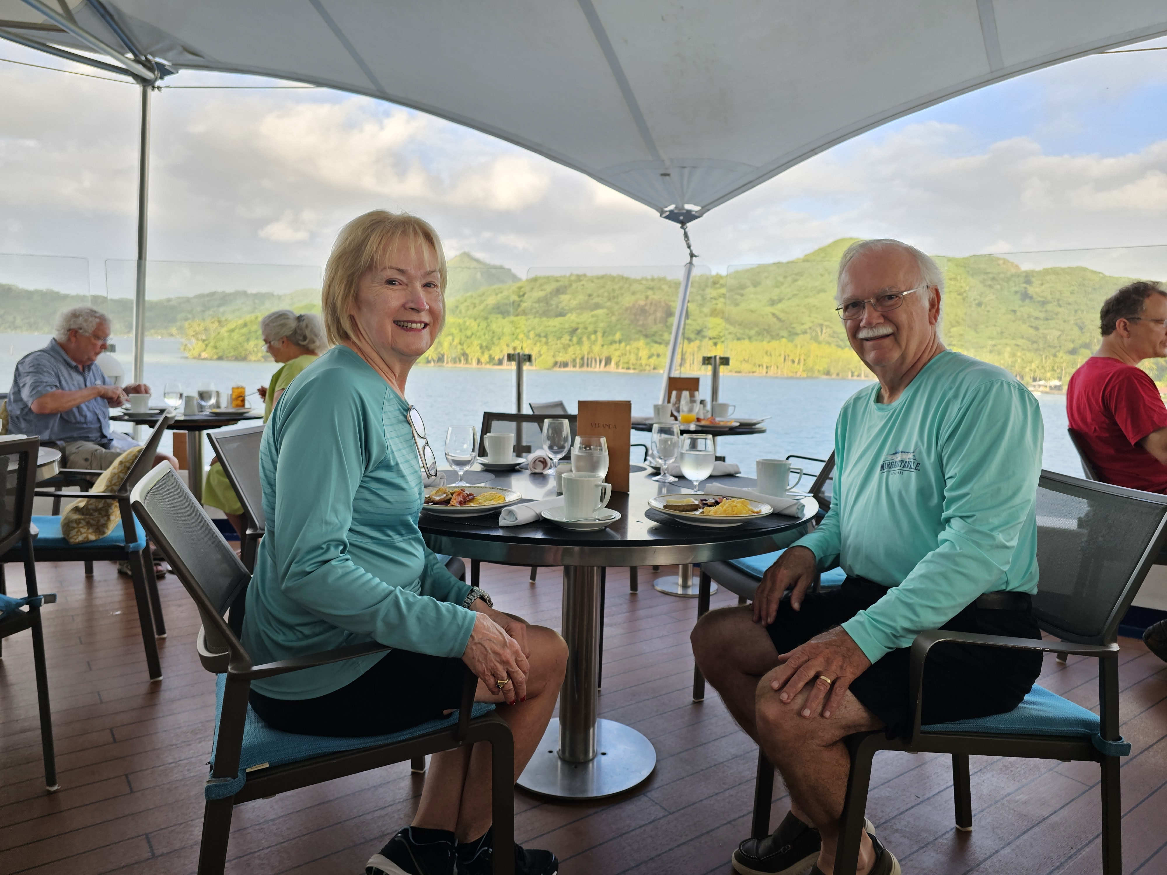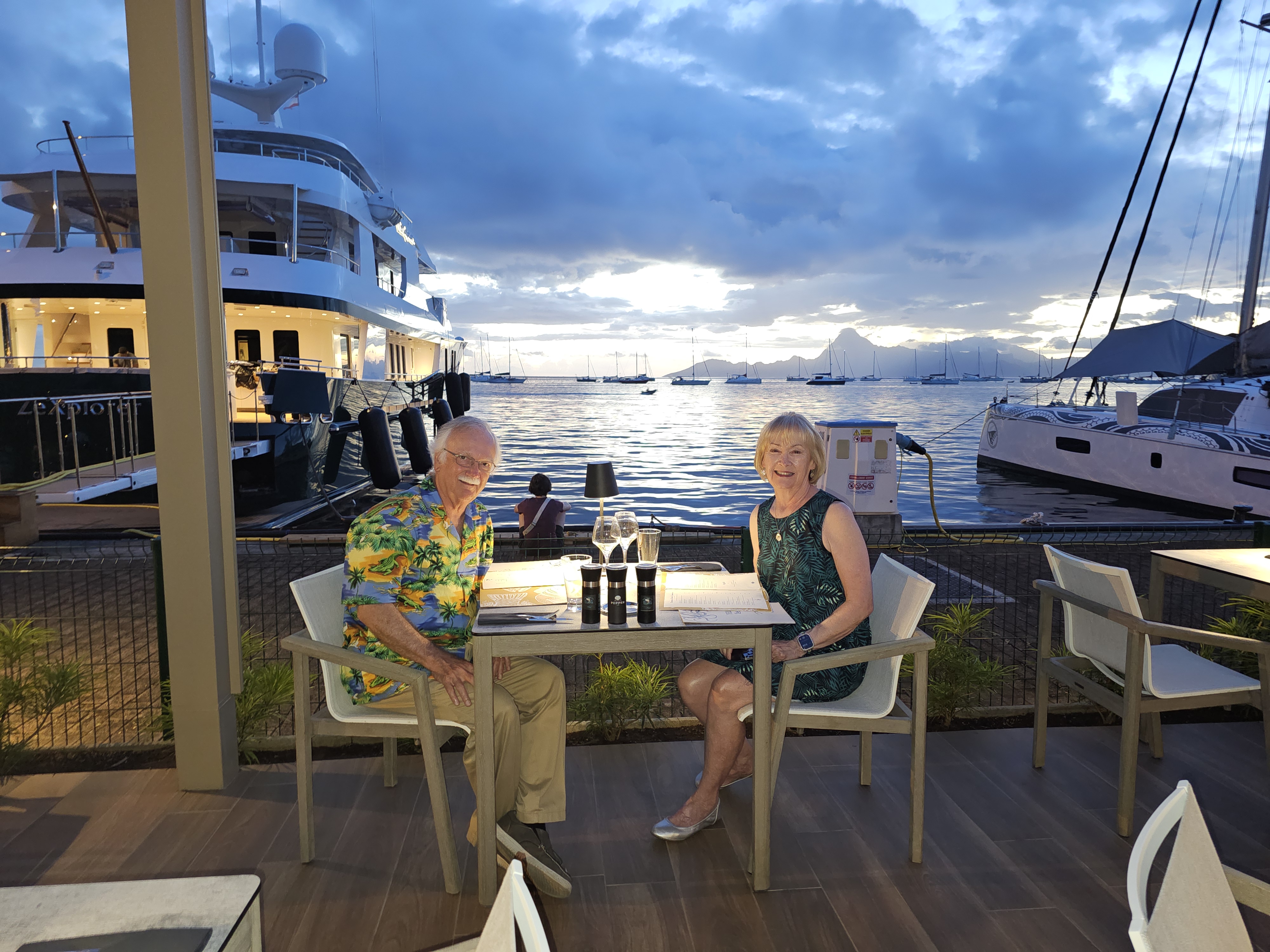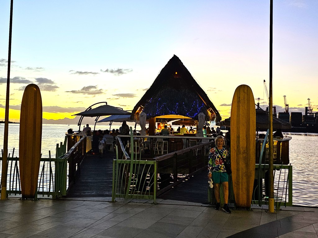 After 11 days we disembarked our yacht the Sea Breeze back in Papeete. We stayed in Tahiti two more days waiting for a suitable plane connection home. Paula found an Air BnB that is a cute little bungalow on the water, close to the airport but hidden behind a McDonalds and a Mobil Station. Took us a while to figure out how to get in. It had a covered dock that we sat on, using our devices and gazing out at sailboats and Moorea, the next island to the west that we had visited the day before. We found a nearby marina restaurant that had the same view.