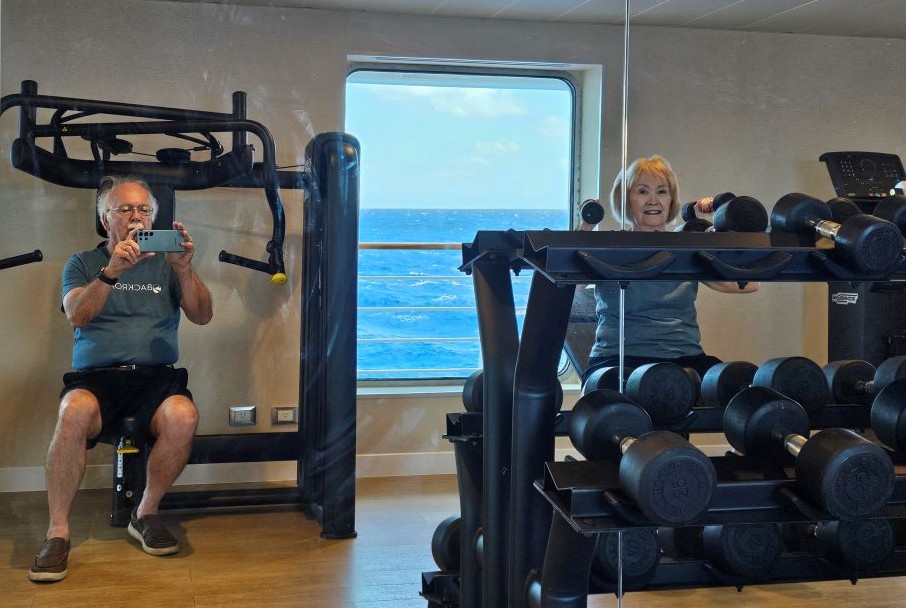 Day 3 was at sea all day. It took about 30 hours of sailing to get to our first destination, the Fakarava atoll. The sea was fairly rough, so walking was a little wobbly. The planned 1 mile power walk around the top deck was cancelled because the deck kept moving. Wanting to get at least some token exercise, we used the gym.