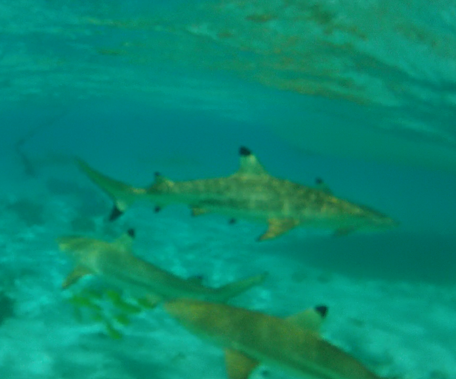 Starting to get the relaxed vibe of the islands, we stopped at Fakarava Atoll and Rangiroa Atoll. Both are classic examples of an older atoll, where the formational volcano has completely collapsed back into the sea and all that remains is a ring of coral reef with a few palm trees, a few people and a big interior lagoon, often several hundred square miles in extent. Both days we anchored inside the atoll, so the water was relatively calm and good for snorkeling. John snorkeled three times, one a drift dive in the open ocean outside the entrance pass, and Paula two times in the lagoons.
